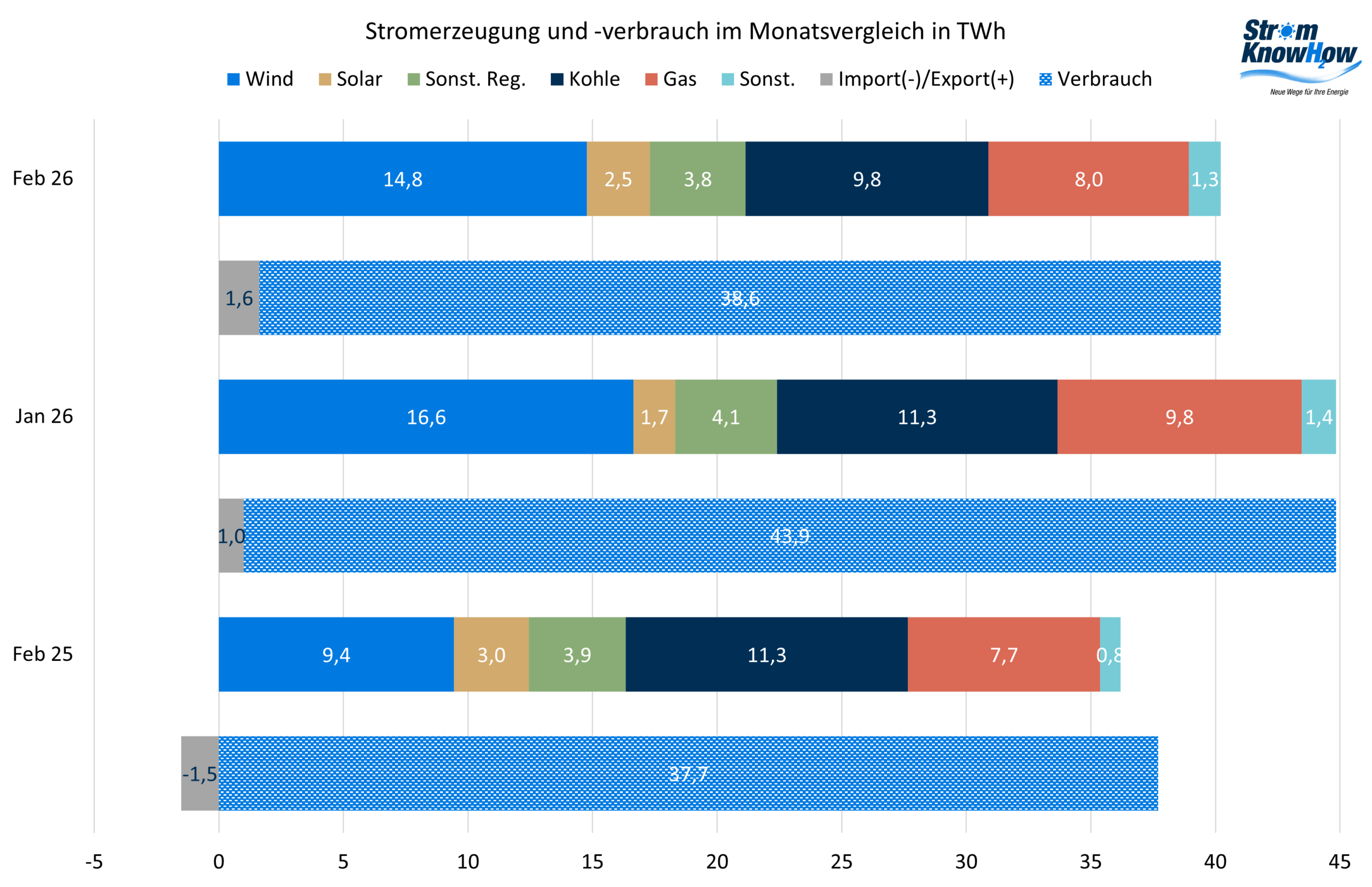 Der EE-Stromanteil lag mit 54,8% für einen Wintermonat auf ordentlichem Niveau, auch wenn die Wunschzahl von 65% aus dem Gebäudeenergiegesetz nach wie vor in weiter Ferne ist.