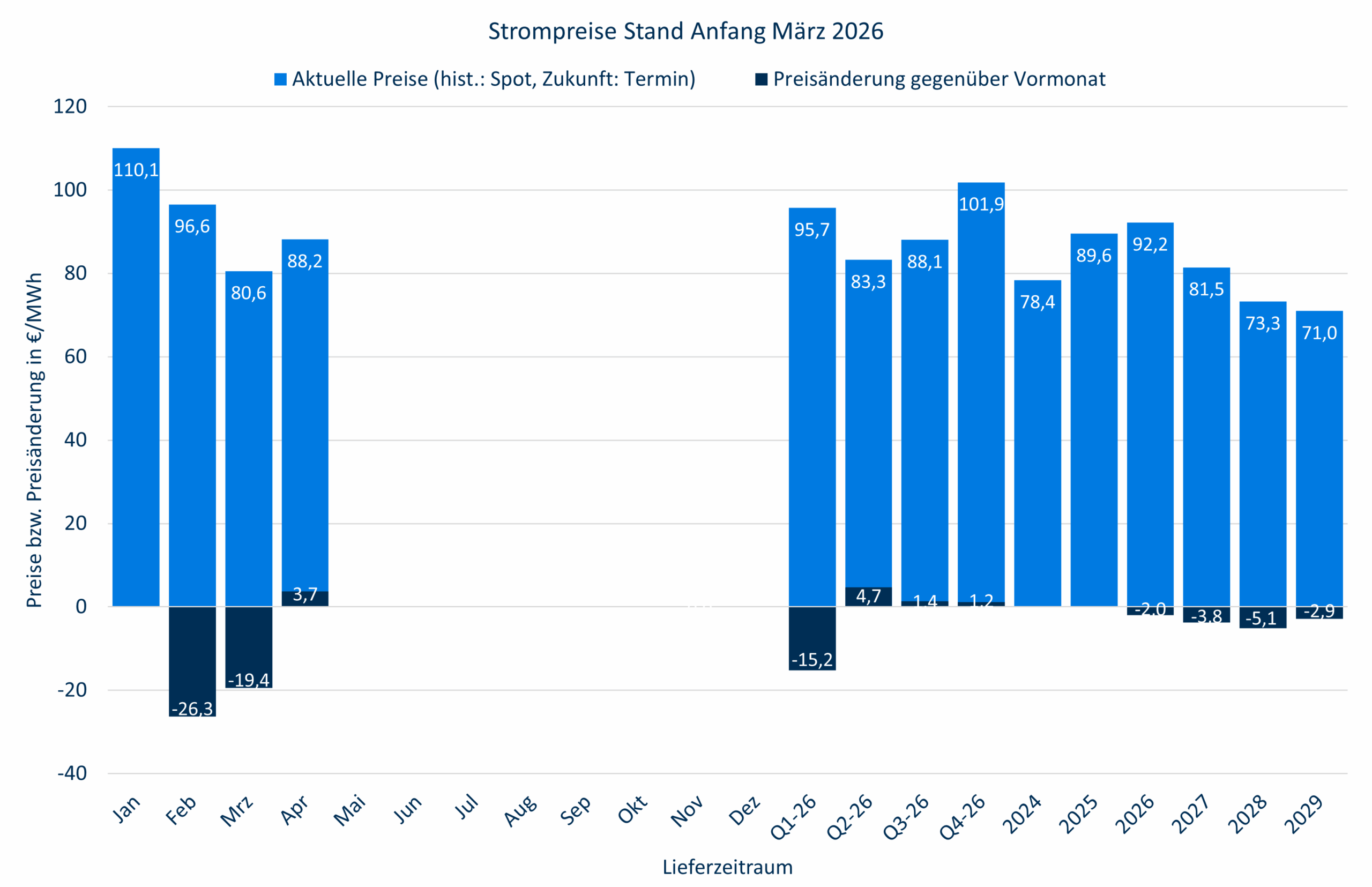 Bis Ende Februar waren die Strompreise auf breiter Front im Rückwärtsgang, trotz des abrupten Gaspreisanstiegs aufgrund der Kampfhandlungen im Mittleren Osten, verbleibt bislang ein Minus.