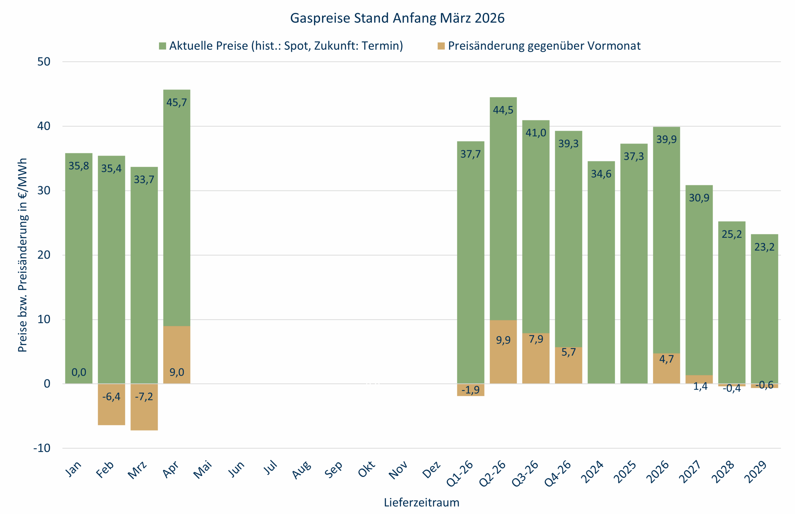 Seit dem 02.03. sind die Gaspreise sprunghaft angestiegen, allerdings nur für das aktuelle Jahr, für die Folgejahre gibt es kaum Änderungen im Monatssaldo. Ursache ist ausschließlich die militärische Auseinandersetzung im Mittleren Osten und die Befürchtung, dass die Straße von Hormus längere Zeit geschlossen sein könnte. Der aktuelle Spotpreis für Erdgas liegt in etwa auf dem gleichen Niveau wie vor Jahresfrist.