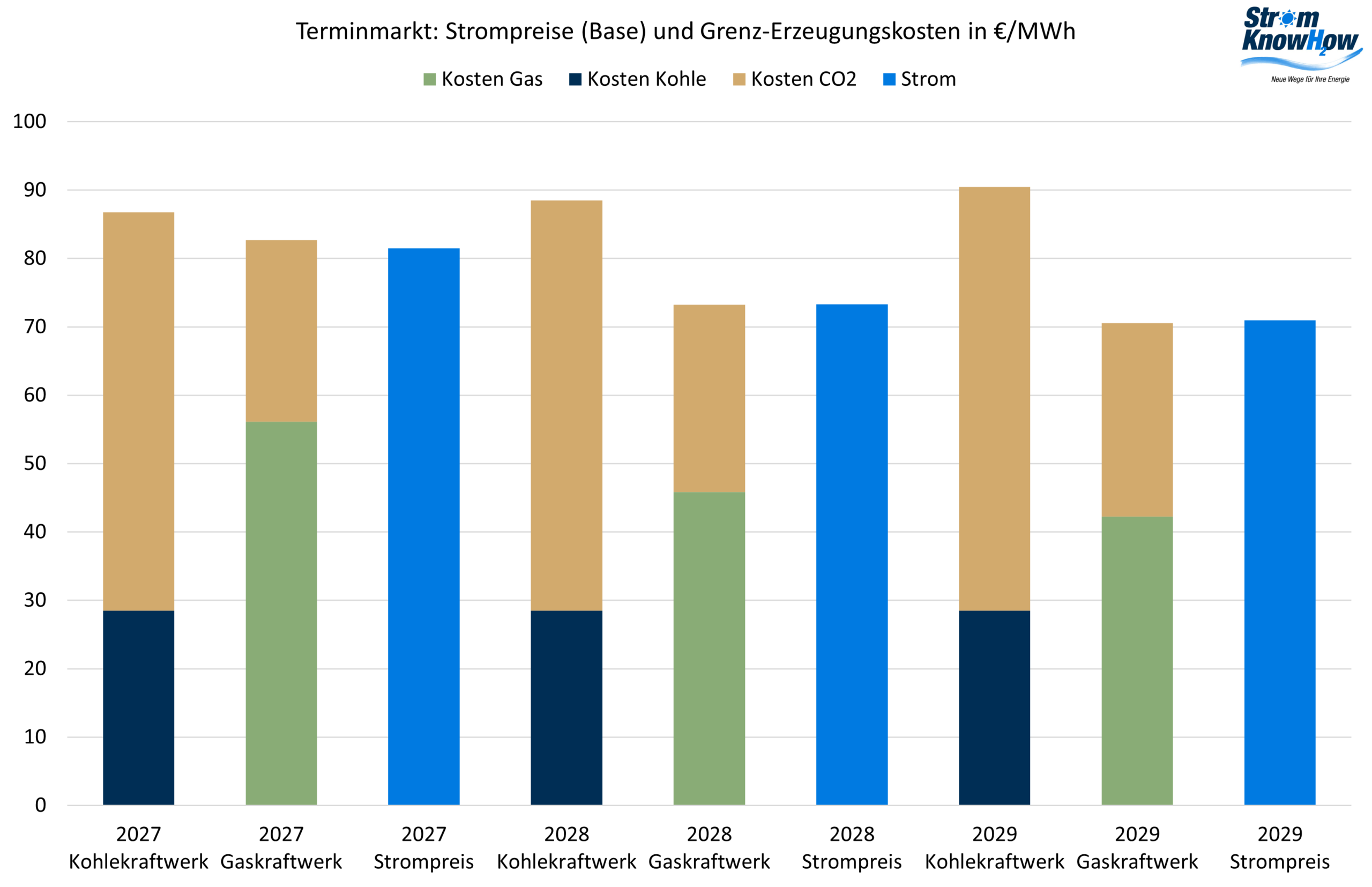 Die Entwicklung am Gasmarkt spiegelt sich auch in den Strompreisen wieder. Allerdings kommt hier noch der CO2-Preis hinzu. Es mehren sich Stimmen in der EU, den CO2-Preisanstieg zu dämpfen, um die Wettbewerbsfähigkeit der europäischen Industrie nicht noch weiter zu zerstören. Der folgende CO2-Preisverfall um mehr als 10 €/EUA wirkt sich entsprechend preissenkend beim Strom aus. Die Kaufsignale waren insofern beim Strom noch etwas deutlicher als beim Erdgas. Was bei den Emissionshandelssystemen tatsächlich passiert, wird man erst im Laufe des Jahres sehen.