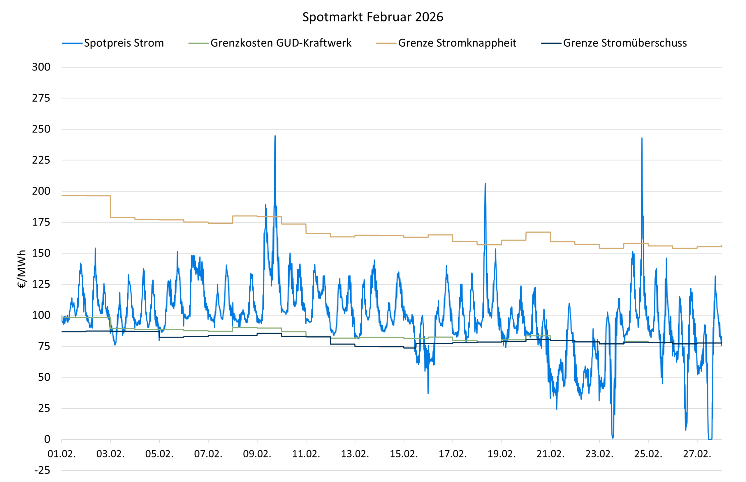 Der durchschnittliche Spotpreis ist deutlich auf 96,6 €/MWh gesunken. Verantwortlich war neben der guten Windstromerzeugung ein Rückgang bei den CO2-Preisen, während der Gaspreis im Mittel trotz der niedrigen Speicherstände weitgehend unverändert gegenüber dem Januar blieb.